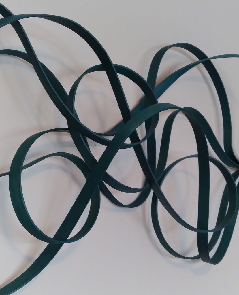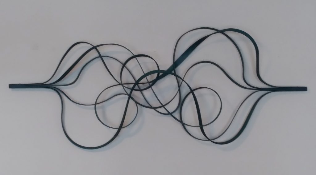 This piece – a blue-green tangle of bent wood collected at both ends – is about 54 inches long by 24 inches high. Calm at the beginning. Stormy in the middle. Calm again when it’s all over.